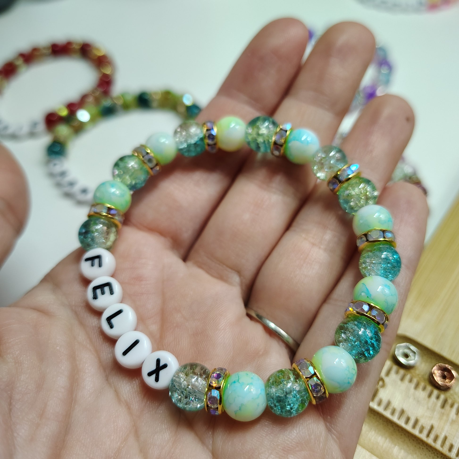 Bracelets are made with glass beads and stretch elastic with either rhinestone or metal spacers.
